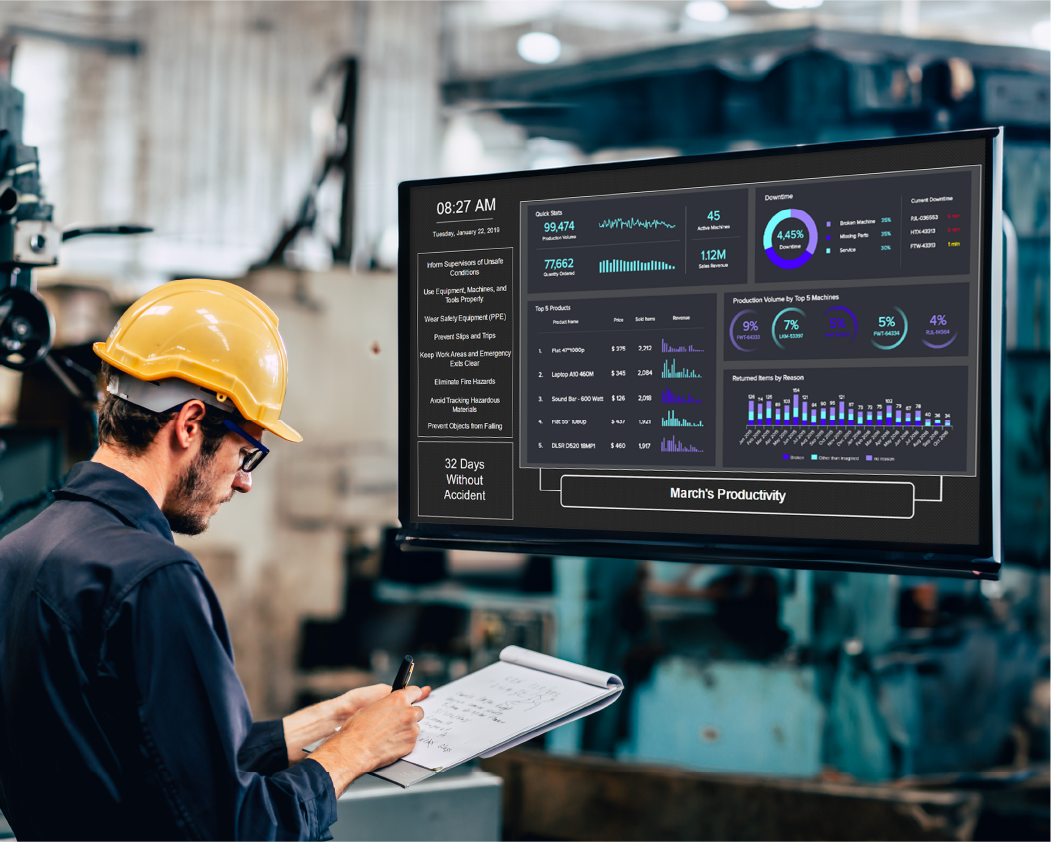 It lets you share targeted content to specific screens on your display — so all your different teams get contextual messaging on their screens. You can streamline communication, improve decisioning, and build a healthy workplace — all with one solution for your manufacturing facility.